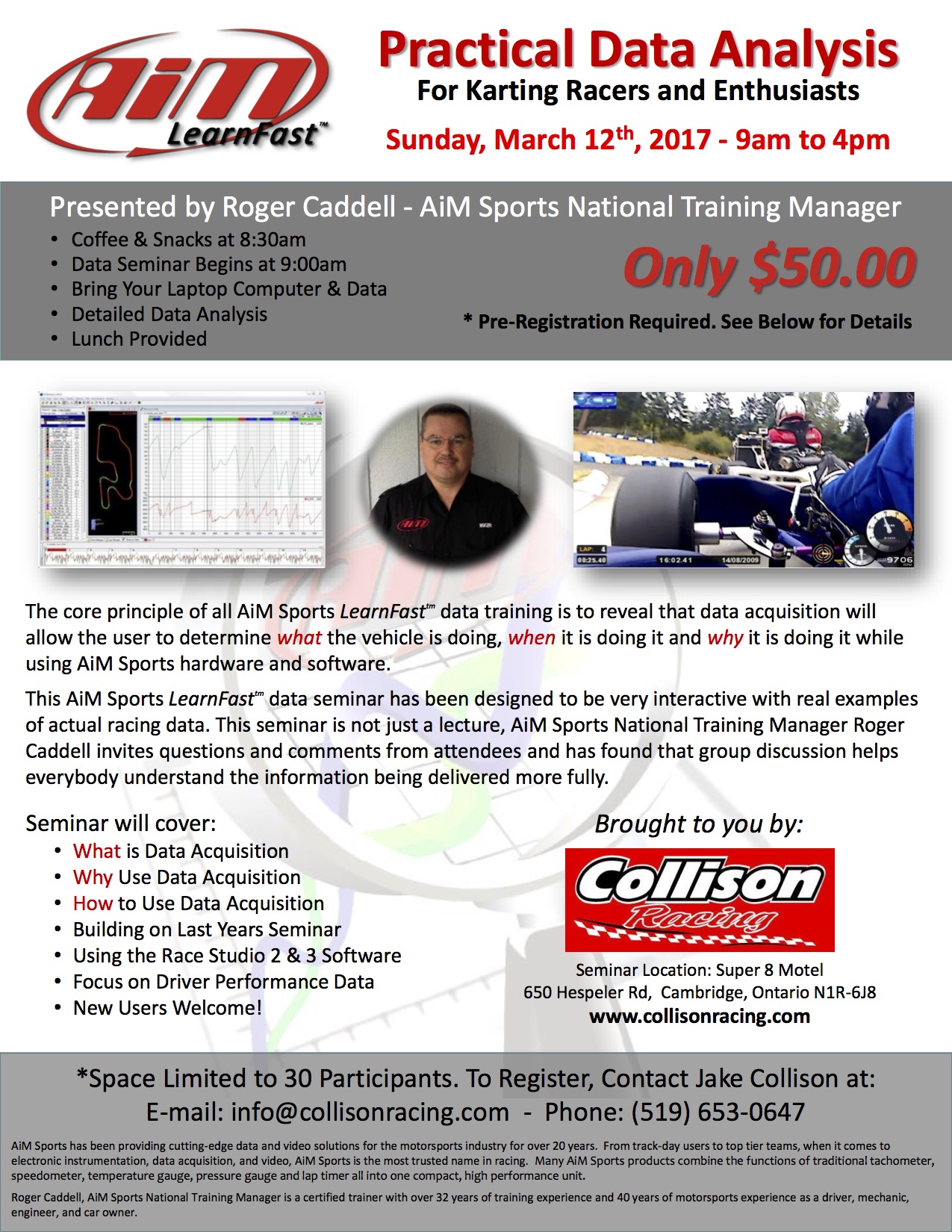 Registration is required and is limited to 30 participants. Contact Jake Collison immediately to register, info@collisonracing.com or 519.653.0647.