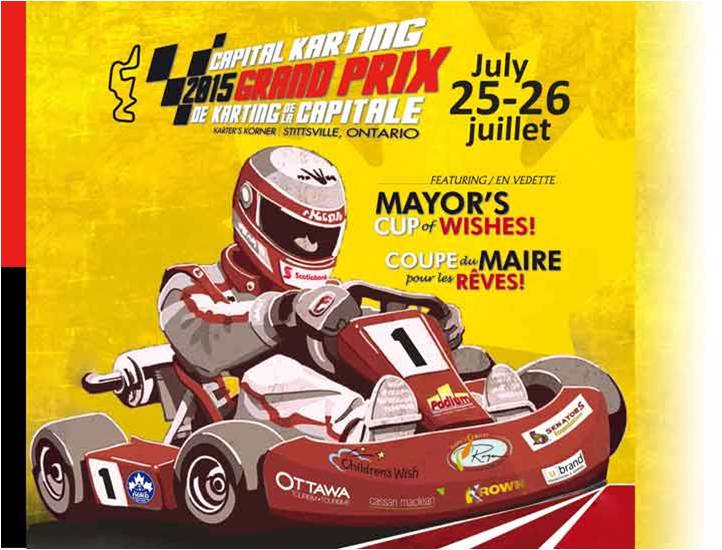 With less than two weeks to go before the event, Podium Special Events Management and the National Capital Kart Club (Host Club) are happy to announce that preparations are almost complete and Ottawa is ready to host the inaugural Edition of Capital Karting Grand Prix (CKGP) & Mayor’s Cup of Wishes Charity Challenge on July 25-26, 2015 at Karters Korner. Kart racers from Ontario, Québec and other parts of North America will be competing for over $5000 in cash and prizes in four Briggs classes (novice, junior, senior and masters) and one 4 stroke GT class (a mix of Honda and Briggs!!). Other promotional events include a car show with Formula Race Cars, Muscle Cars, Tunders & Exotics, a Family Fun Zone with face painting, balloons, inflatables for the kids and so much more! Come have some fun!