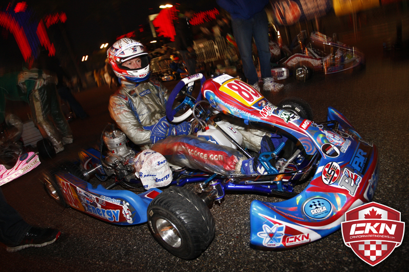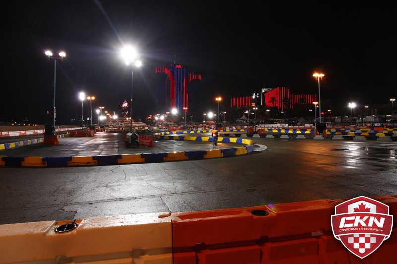 Thursday brought completely new challenges to the game. With the skies opening up and rain being poured down in Vegas I knew it was going to be a rough day. Don’t get me wrong, I love racing in the rain. But Tag Sr. was set to practice in the night and the Supernats was already 3 hours behind schedule before we even started our sessions. On top of that, the parking lot the track sat on was the run off for the Rio. So there were huge puddles for us to deal with on track. One slight mistake and it would have been disastrous for any driver. Lucky team BRK and I we’re prepared for the rain bringing plenty of rain tires for our team to compete in the wet conditions unlike many other competitors. All throughout the rain we we’re fast but nothing special. We knew that when it counted we would probably pull of a top ten wet qualifying if that was the case of conditions. So there was still room for improvement. All throughout the day of sessions we we’re top ten again playing with many different setups as I was struggling with trust with the chassis. In the rain I am really particular with the chassis. In the dry you can give me a cardboard box and I will push the thing as fast as I can get it to go. With the rain I need to be comfortable. I am not very tall and in Tag Sr. there was a lot of weight so I could not make the chassis work as I had been able to do in KF Junior in Europe. That being said even when our complete package driver included wasn’t perfect we were still a force to be reckoned with. In the end Thursday was a decent day, but we would be brainstorming for more speed for Friday.