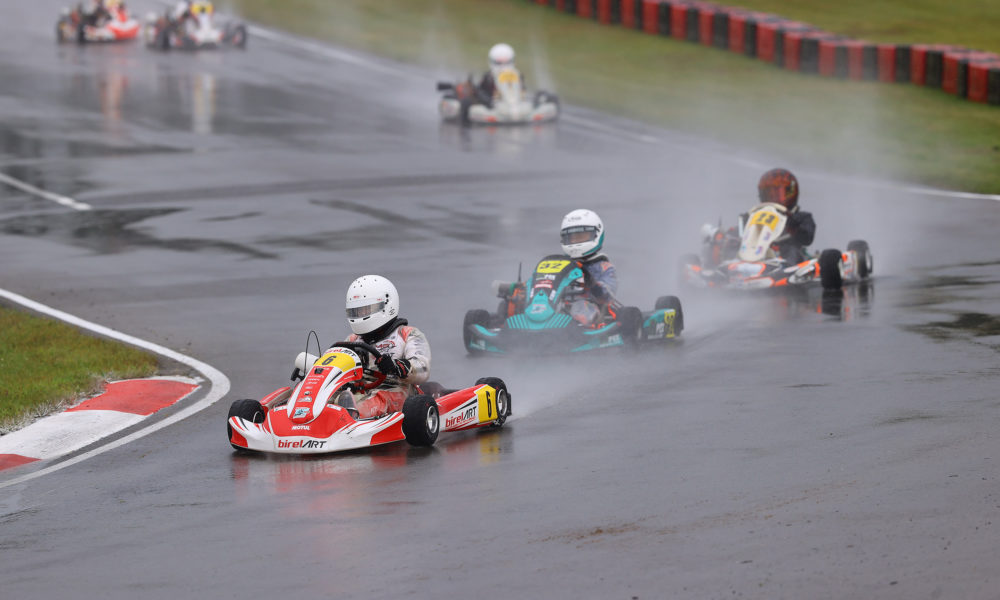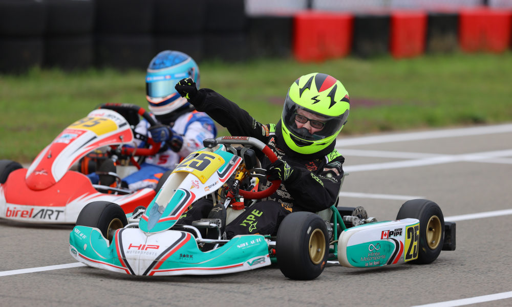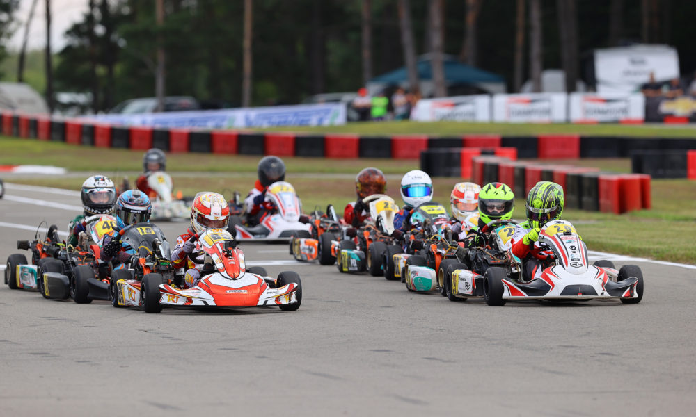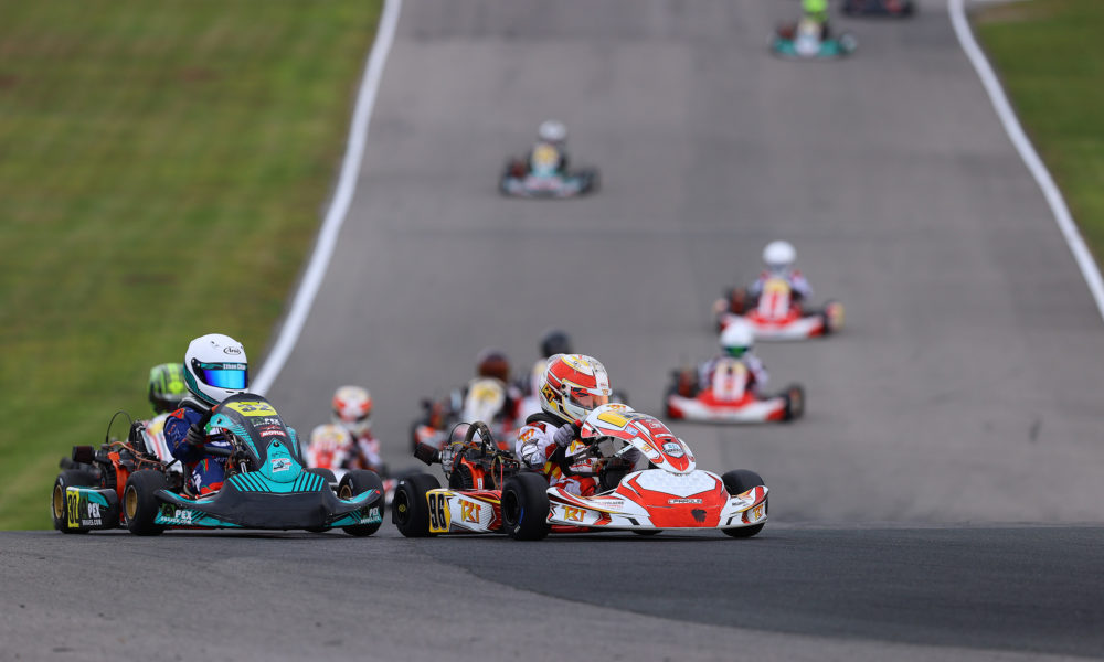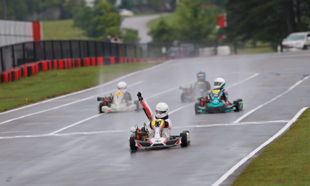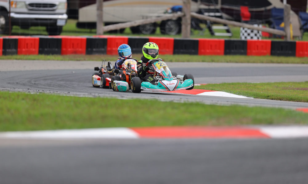 Unfazed, Jackson Pearsall (CL Kart) led the field to the green flag but came under early pressure from Edward Kennedy (Parolin) and Alexis Baillargeon (Parolin). Unfortunately for Kennedy, he spun in corner one the next time by when he hit the puddle just a little too deep.