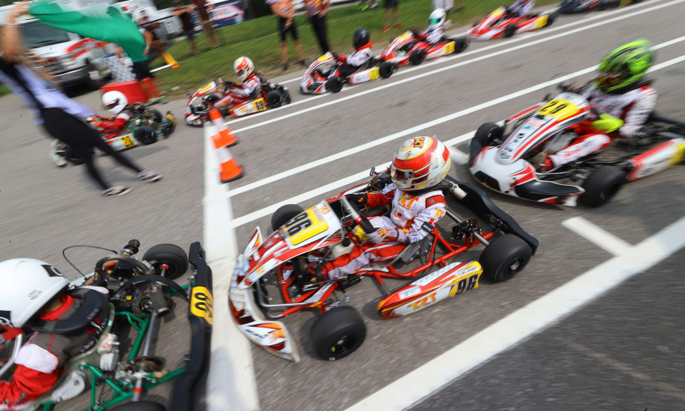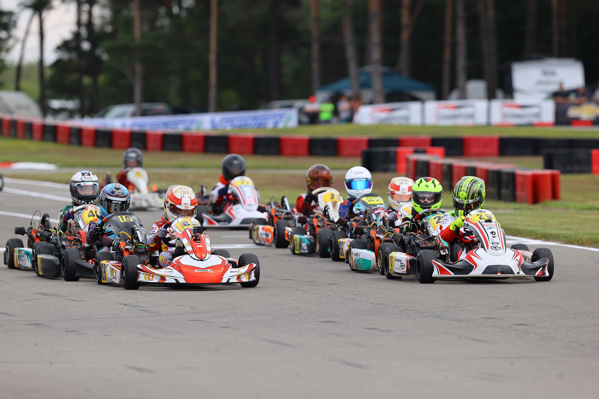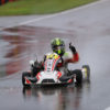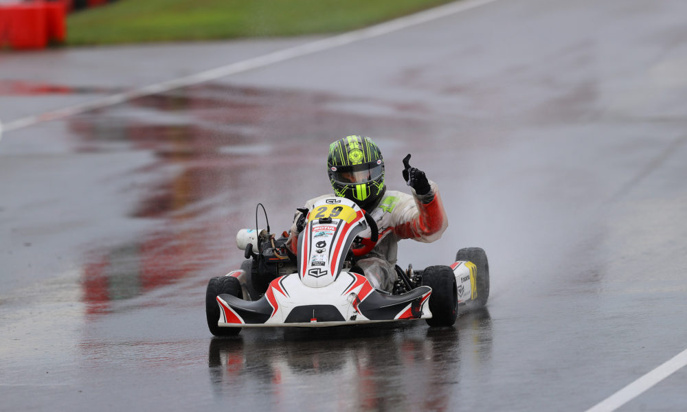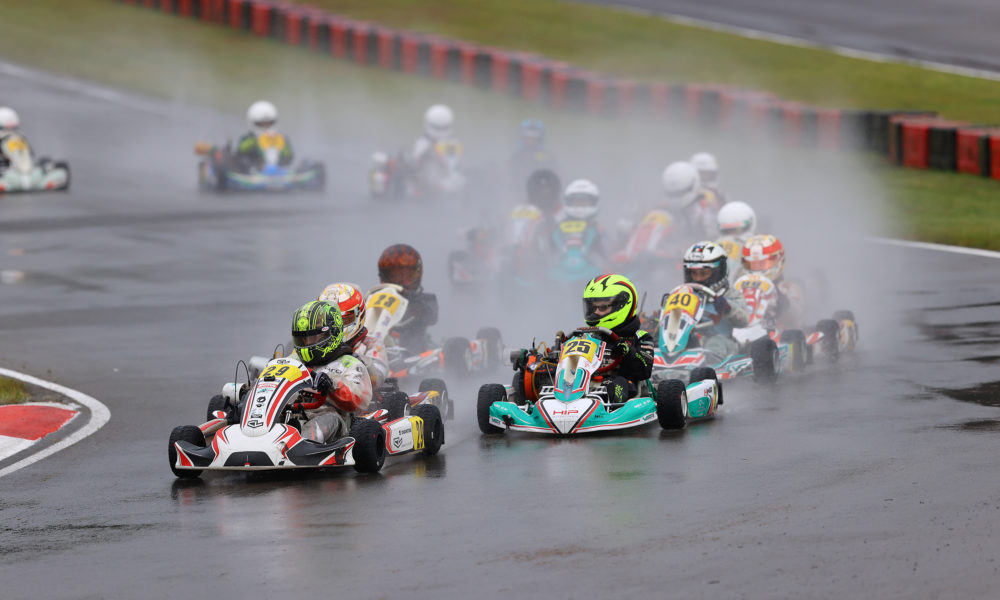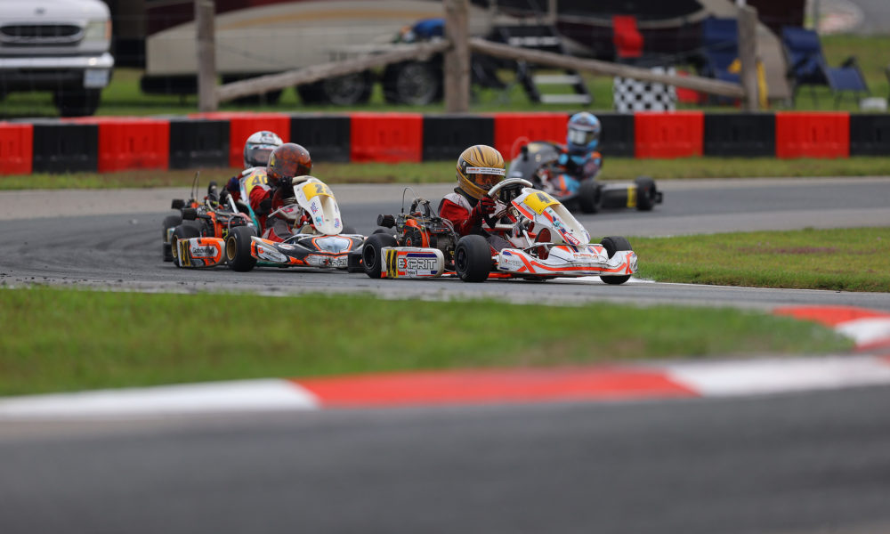 Unfazed, Jackson Pearsall (CL Kart) led the field to the green flag but came under early pressure from Edward Kennedy (Parolin) and Alexis Baillargeon (Parolin). Unfortunately for Kennedy, he spun in corner one the next time by when he hit the puddle just a little too deep.