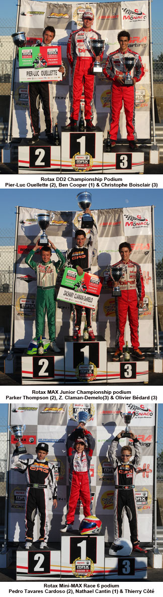 In the Rotax MAX junior class, two drivers did participate at the whole championship. Olivier Bédard (SRA / Birel) took the third place and Jeffrey Kingsley, at his first season in Junior, finished 5th. Nicholas Doré and Cedric Lupien finished respectively 13th and 36th.