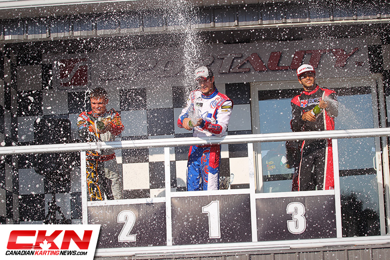 Marco Signoretti celebrates his Rotax DD2 victory with the spraying of champagne. (Photo by: Cody Schindel / CKN)