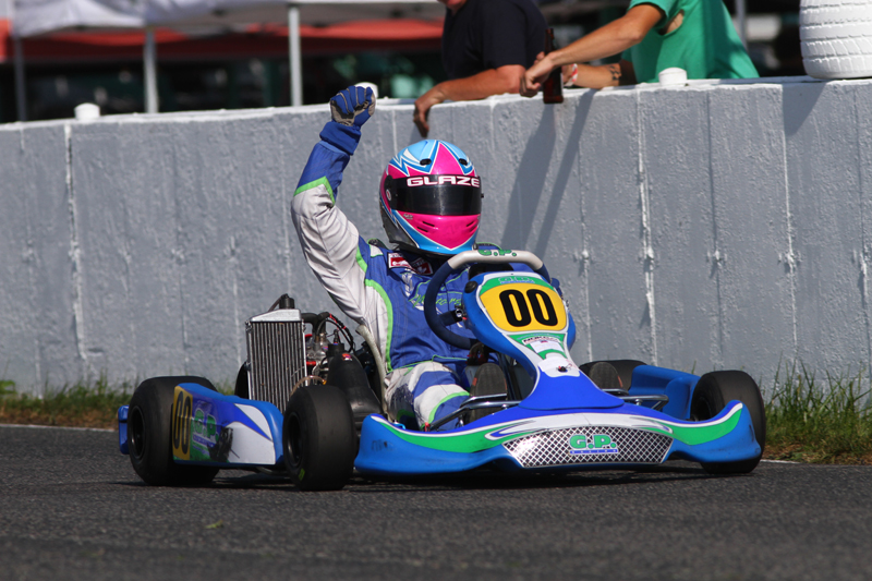 Melissa Glaze scored a crowd favourite victory in Rotax/TaG Senior Final 1. (Photo by: Cody Schindel/CanadianKartingNews.com)