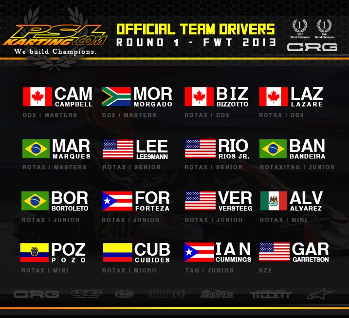 In the ultra-competitive and stacked fields in the Rotax Senior class, two American powerhouses are set to fly PSL colours during the FWT. Making his return to the CRG brand will be former Team USA member Jesus Rios Jr. No stranger to the PSL team or the Florida Winter Tour, Rios Jr. will be vying for race wins and the overall championship title in his efforts to earn a return invite to the Rotax Max Challenge Grand Finals (RMCGF). Joining Rios Jr. is California native and 2012 SKUSA Pro Tour champ Fritz Leesmann. Again pulling double duty in both the FWT and the Rotax Challenge of the Americas (CoA) on the west coast, Leesmann already has two wins under his belt in 2013 racing action as he doubled up in Tucson last weekend in CoA action.