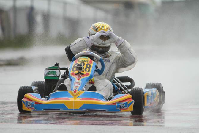 Jack Weprin (USA) would lead the pack of Juniors to the green in the pre-final. This race would go a handful of laps before the skies opened up in a deluge of rain. With the karts on slick tires, the decision was made to stop the race and let them have the option of switching to rain tires. Even with the switch, Weprin was still the man to beat as he took the pre-final win.