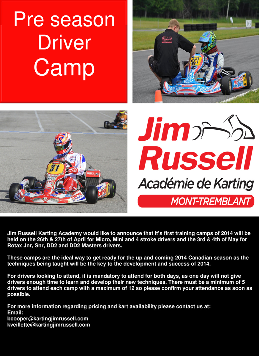 Jim Russell Karting Academy would like to announce that it’s first training camps of 2014 will be held on the 26th & 27th of April for Micro, Mini and 4 stroke drivers and the 3rd & 4th of May for Rotax Jnr, Snr, DD2 and DD2 Masters drivers.