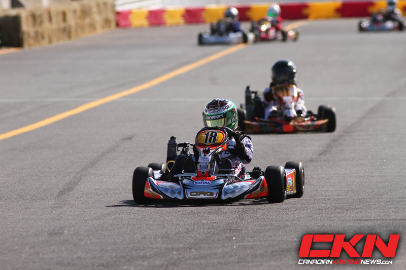 In the Rotax Micro-Max division, Matthew Latifi (Ferrolati Corse/CRG) continues to tear up the class in his rookie season. After trading the lead in the pre-final with Matthew Barry (Intrepid), Latifi took charge in the final, needing only one lap to get out front and stay out front. Unfortunately for Barry his second place finish would be removed due to a post-race technical infraction, allowing Thomas Simard (SRA Karting/Birel) and Andres Filipe de Alba Escoba (TonyKart) to step on the podium in second and third place. Alexandre Soma (CRG) and Jonathon Daigle-Bleau