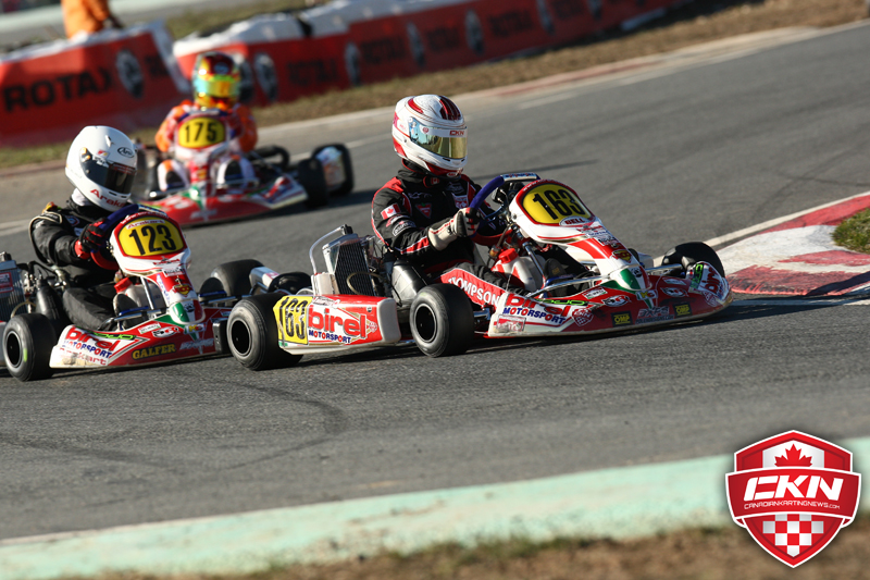 Kicking off the days action, Rotax Junior was on track first for their pre final. A wild start would see all three Canadian’s run into trouble as Parker Thompson, Zachary Claman DeMelo and Zacharie Scalzo were all held up. Scalzo would receive the worst as he lost his nosecone and would have to retire. Doing their best to work back through the field, DeMelo would run as high as tenth before crossing the finish line in twelfth, Thompson in nineteenth, and Scalzo ranked 30th. However following the race, DeMelo would be accessed a 10-second penalty and would be forced to start the final from twenty-third.