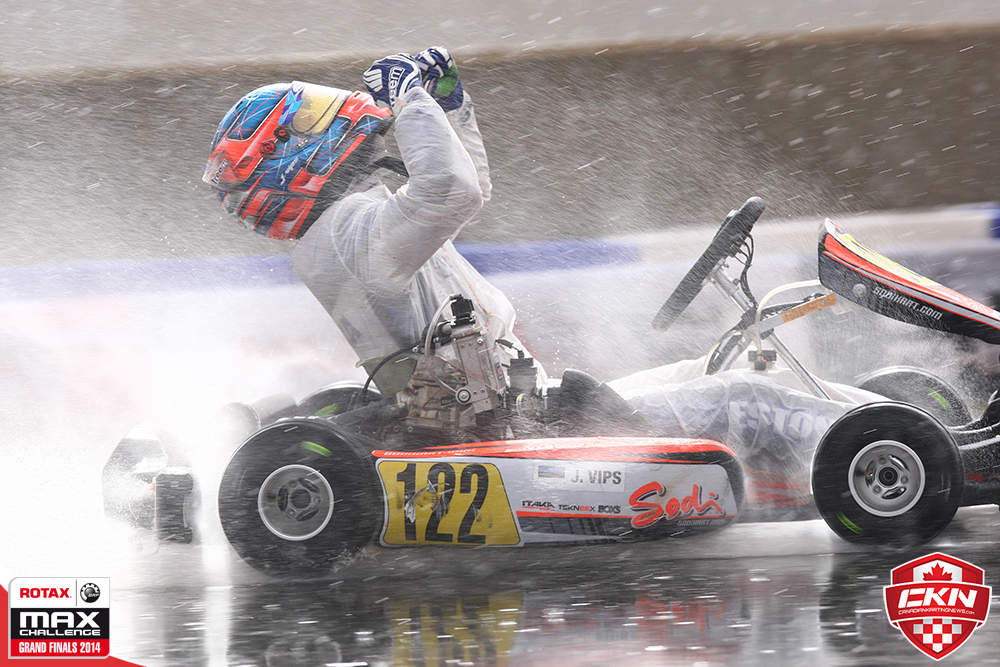 First up for their PreFinal was Rotax Junior and when the lights went out, visibility was zero. With so much standing water on the track, officials halted the race before the first lap was even completed, with more than half going off the track in the opening lap.