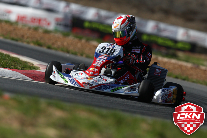 Team Canada drivers, Ben Cooper and Pier-Luc Ouellette were first to take the track in Group 1. Both drivers patiently waited back on the grid as the qualifying session began. The strategy behind this was to wait for the track to fill up with competitors and then add yourself to the mix when you could find the correct slipstream group. Cooper was quick right away as his first hot lap time would place him ahead of majority of the karts that had already completed 5 or 6 laps. His 2nd lap would send him almost to the top of the time sheets. Belgian driver, Xen De Ruwe was extremely fast as he would hold pole position right from the beginning of the session and would never have to look back. Cooper was not able to better his time due to bad luck with traffic and would settle for 2nd. At this point, Ouellette’s battle had just begun. Struggling with motor issues, Ouellette was near the tail end of his group. Though never giving up, he was able to drive a near perfect lap and use the slipstream to his advantage to qualify 20th.