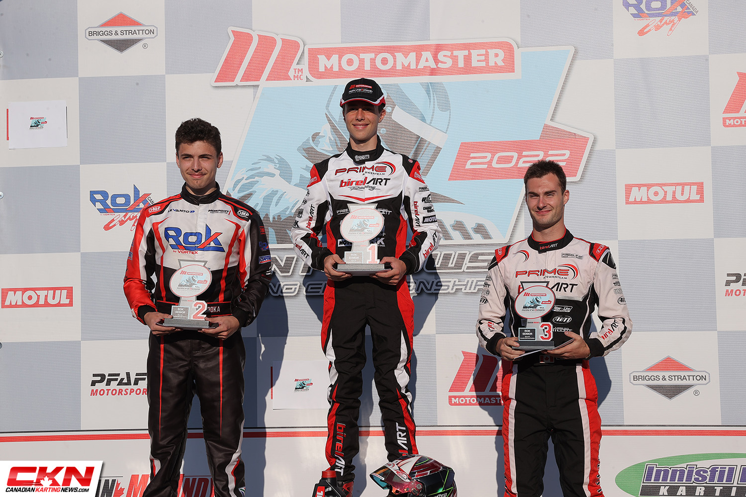 Filice disposed of MacDermid on the opening lap to take second place. Some late-race pace saw him shorten the gap to the leader, but was never close enough to launch an attack. Soroka had to battle back from a slow start that saw him fall back to fifth, but he overtook Noah Taylor (PRO/CL Kart) and MacDermid in the first half of the race to get into third, but the leaders were well ahead of him by then and he cruised to a third-place finish.