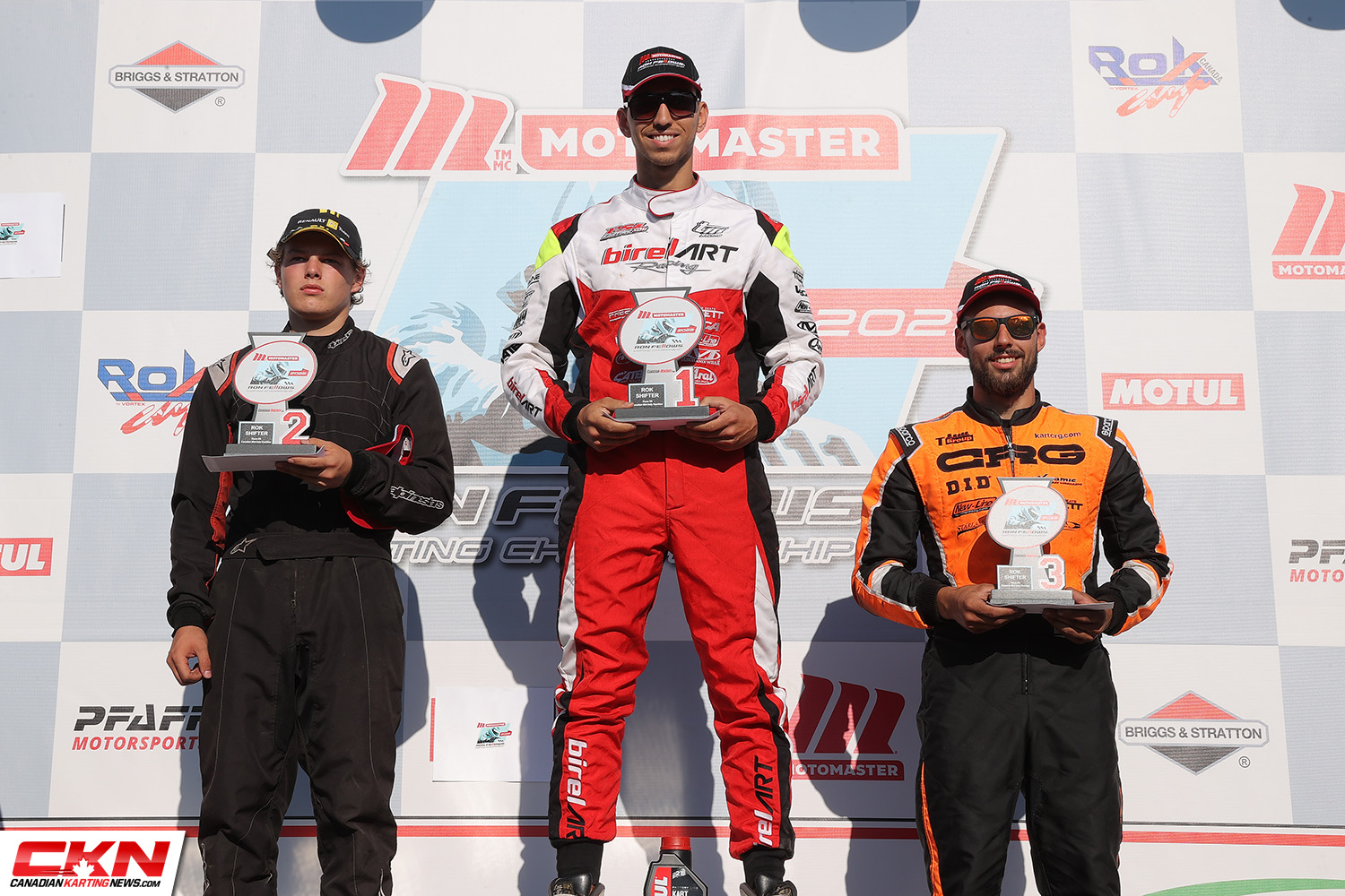 On lap eleven, Paniccia was all over Dante Lerra (BirelART) for third place. Deep on the brakes in corner three, the two made heavy contact that sent them both spinning and down the running order. This promoted Ryan Monteiro (KartWorx/CRG) into third and the running order only changed when both Paniccia and Ramnarayan retired from the race on lap 23 with separate mechanical issues.
