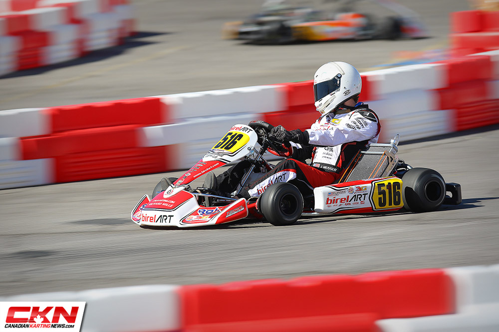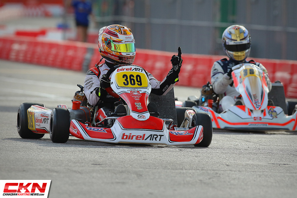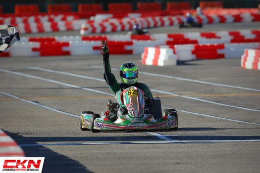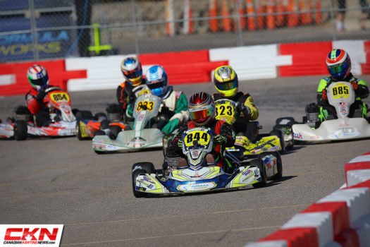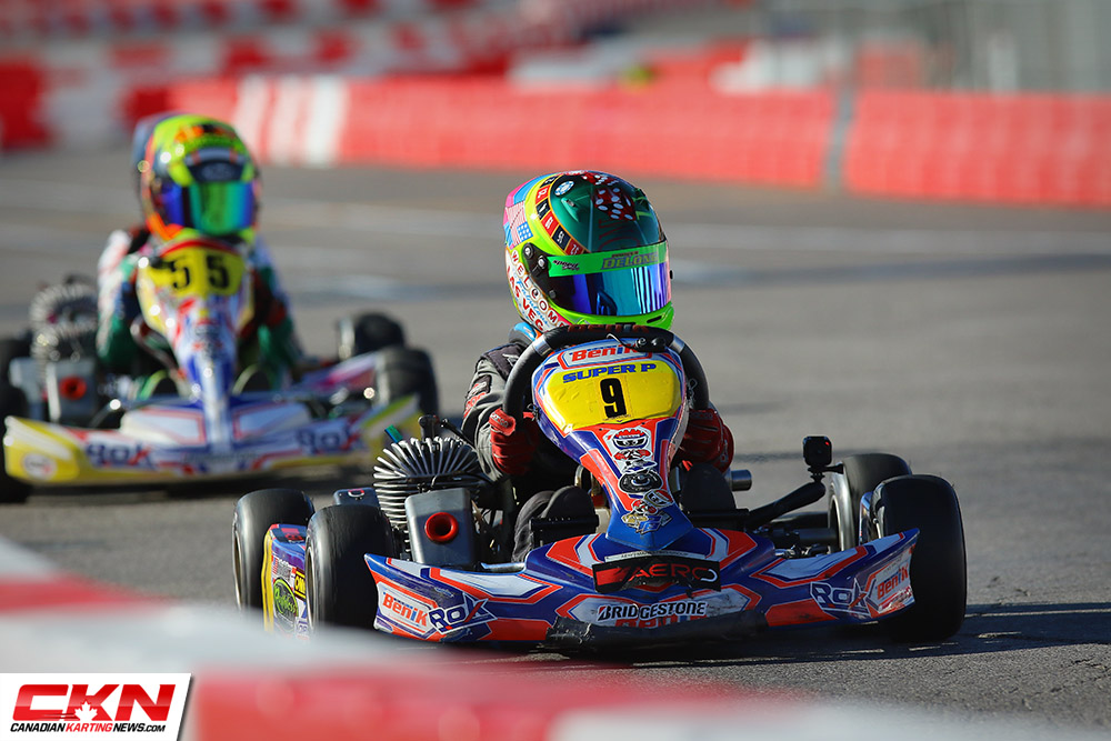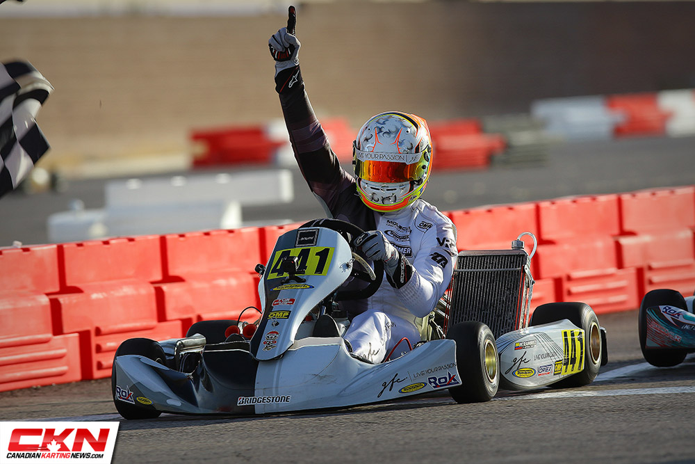 It was a Canadian show in the Vortex ROK Senior class as Ryan Macdermid and Zachary Claman Demelo put on a show. Macdermid took the lead early from his pole position starting spot and led while Demelo fell back into the fourth position. Biding his time and saving his equipment, Demelo worked to pass the third and second place drivers of Axle Cabrera and Jake Denmark-Gessel before setting his sights on Macdermid. Closing the eight-kart length gap in a matter of laps, Demelo slipped by Macdermid down the long back straight with two laps remaining but Macdermid returned the favor on the last lap, just three corners from the end. Macdermid topped the podium with Demelo in second. Cabrera stood on the podium in third with Denmark-Gessel in fourth. Ryan Norberg drove forward from his fourteenth place starting position to round out the top five.