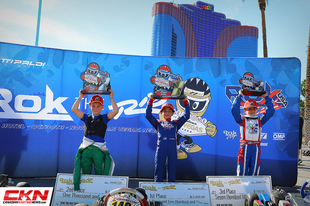 A quartet of drivers would break away from the field in the Vortex Micro ROK final and put on one of the best battles for the win all of Saturday. Outdueling the 21 drivers strong field, Parker Delong claimed the checkers and secured the first ever ROK the RIO Micro ROK Championship. Delong continually improved throughout the weekend scoring the fourth heat race win and carried that momentum into Saturday. Caleb Gafrarar had a great weekend and looked to be the driver to beat, but came up just short on Saturday to finish second. Bernado Gentil improved from his seventh place starting position to stand on the third step of the podium while Sebastian Garzon and Matias Orjuela completed the top five.