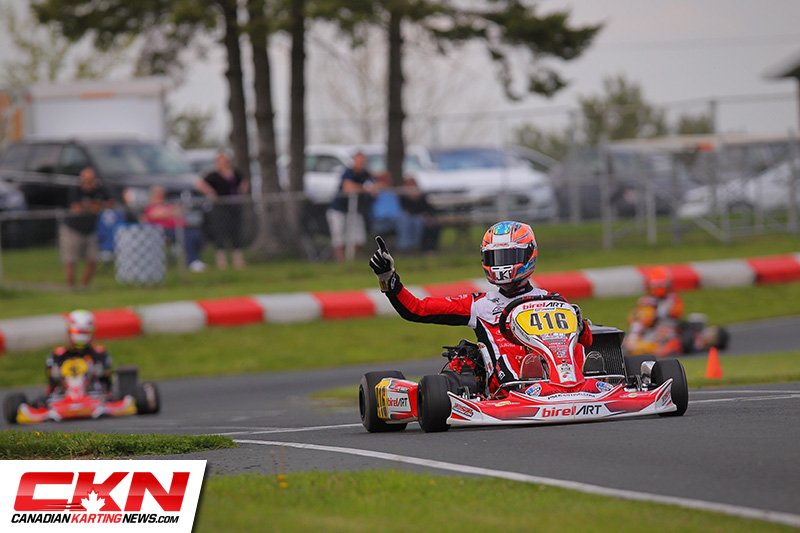 In the race for third, Tyler Kashak (Goodwood/Intrepid) and Zachary Claman DeMelo (Goodwood/Intrepid) made contact on lap two, sending DeMelo back to eighth and allowing Marco Signoretti (Energy Kart Canada/Energy Kart) to advance up to third. But Kashak would regain the position by halfway.