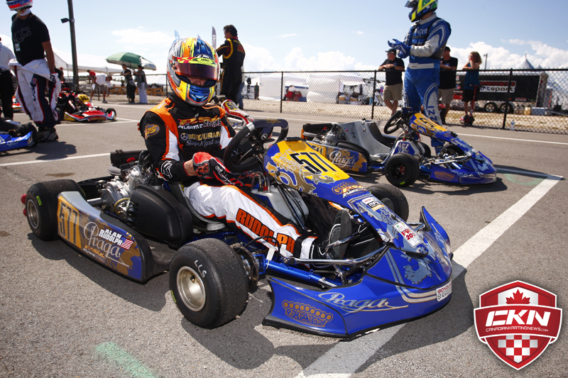 Fernando Guzzi (Praga) of Brazil through he earned his second heat win of the day in heat three, but a technical violation removed him from the results and moved American Scott Falcone (Praga) to the top of heat results. Falcone will start third for the Prefinal with Costa Rican Andrea Fonseca (CRG) beside him, while Derek Wang (Praga) of the USA and Johannas Rodriguez (Kosmic) of Venezuela fill row three. Guzzi will start the prefinal from eighth while Canadians Francis Mondou (Praga) and Stuart Clark (Maranello) struggled on the day and will start 11th and 16th.