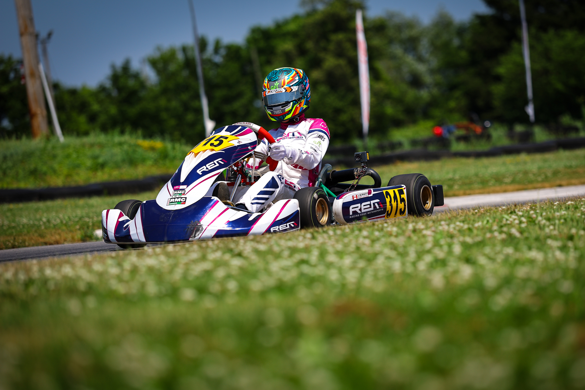 By lap 11, Burnett made his move, diving into the lead and instantly switching to a defensive posture. The tactic worked, but it bunched up the lead group, allowing six karts to join the fight. Ingratta tried a bold outside move in turn one on lap 15, but Burnett closed the door firmly, costing Ingratta momentum. That opened the door for William Bouthillier (REM/Kosmic), who had endured a rough start to the weekend but surged forward in the Final to snatch second place.
