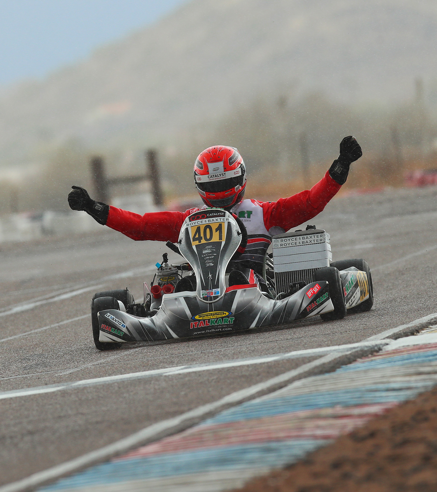 Saturday’s race was a challenge of tire management as the gritty Phoenix Kart Racing Association circuit took its toll on the new LeVanto Tires. Ruscitti was pressured throughout the entire Final but never surrendered the lead en route to the win.