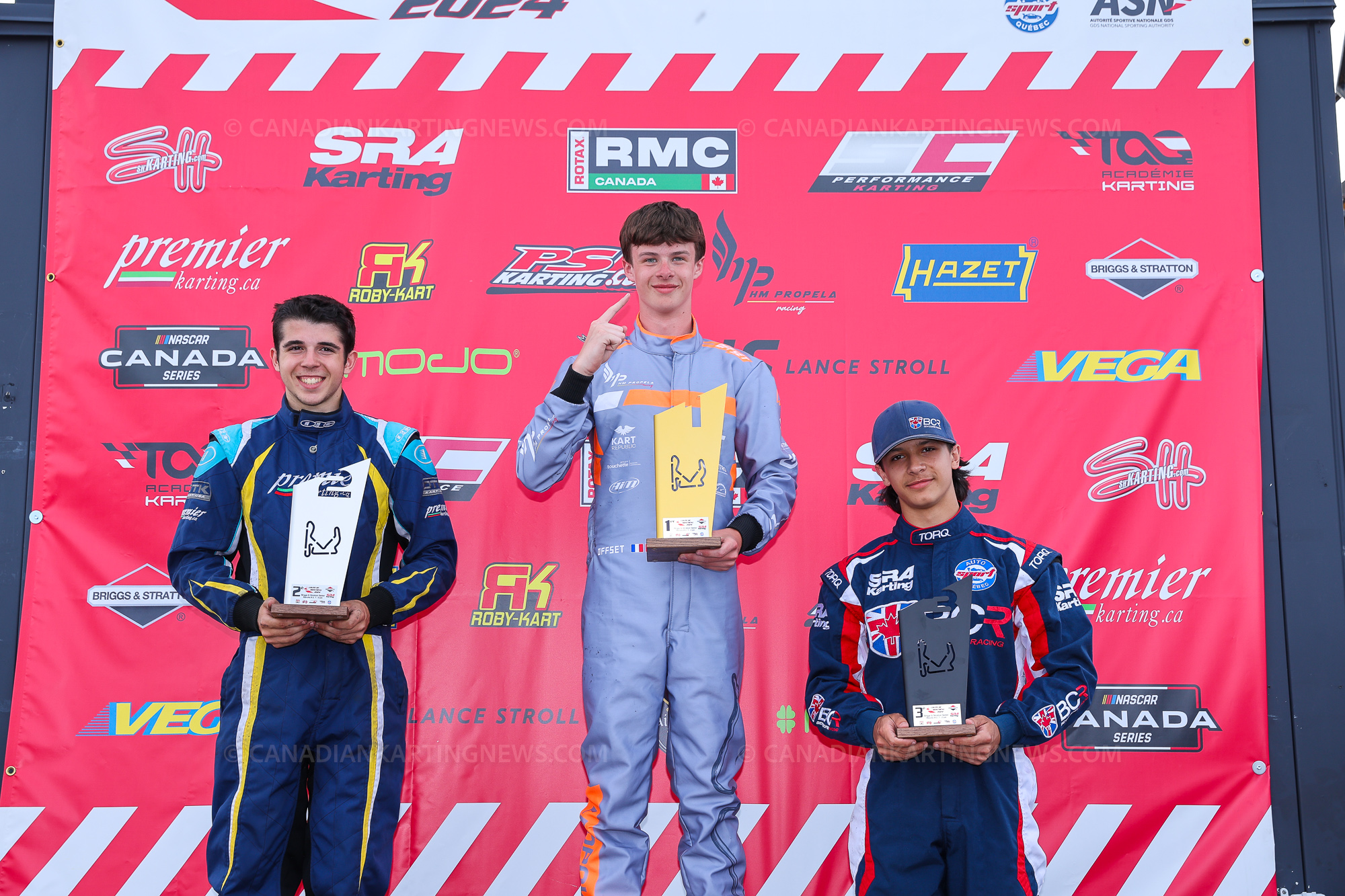 Two groups were needed for Qualifying and the PreFinals in Briggs Senior again as 46 drivers entered the event. Qualifying saw group two dominate the timesheet, posting the top twelve times. Just as they did at SH in round one, the session was led by Steven Navratil (OTK) and his teammate Ari Korkodilos (OTK), this time separated by only 0.003 seconds. Leopold Schrevel (Kart Republic) and Antoine Lacharite (Mac Minarelli) also worked together and ranked third and fourth, barely a tenth of a second back.