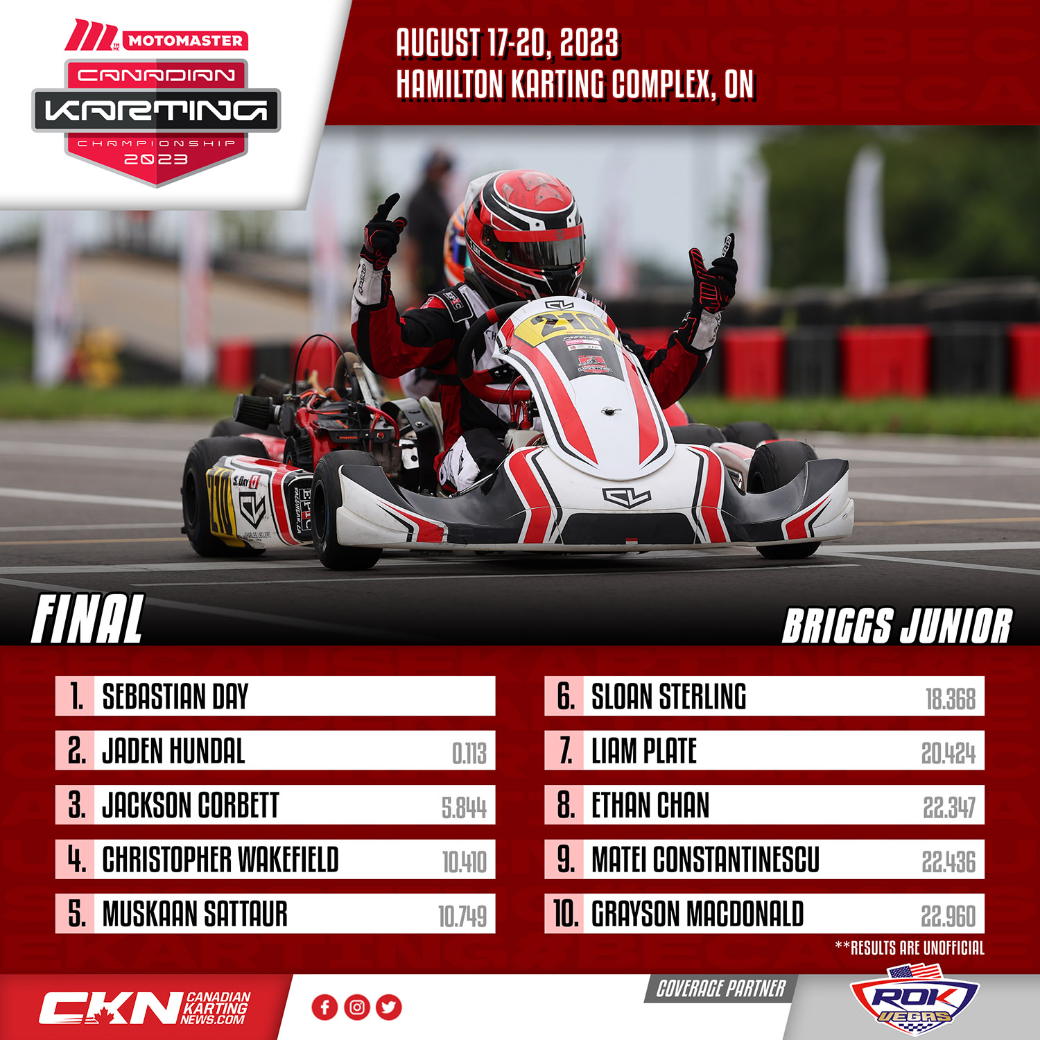 An impressive performance by Sebastian Day has earned him his second Canadian Championship in a row as he successfully defended his title in Briggs Junior at the Hamilton Karting Complex.