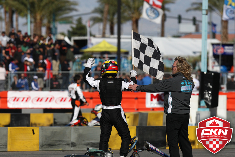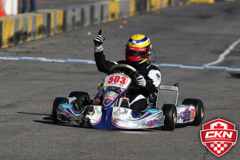 As the field hit the halfway point, Louie Pagano (Birel) was now up front, with Gabby Chaves (Kosmic) and Kiel Spalding (TopKart) in hot pursuit. After making a hard charge back to the front, Michael Valiante’s (Italkart) day was over as contact in turn one with Phil DeLaO (TopKart) forced him into the exit barriers.