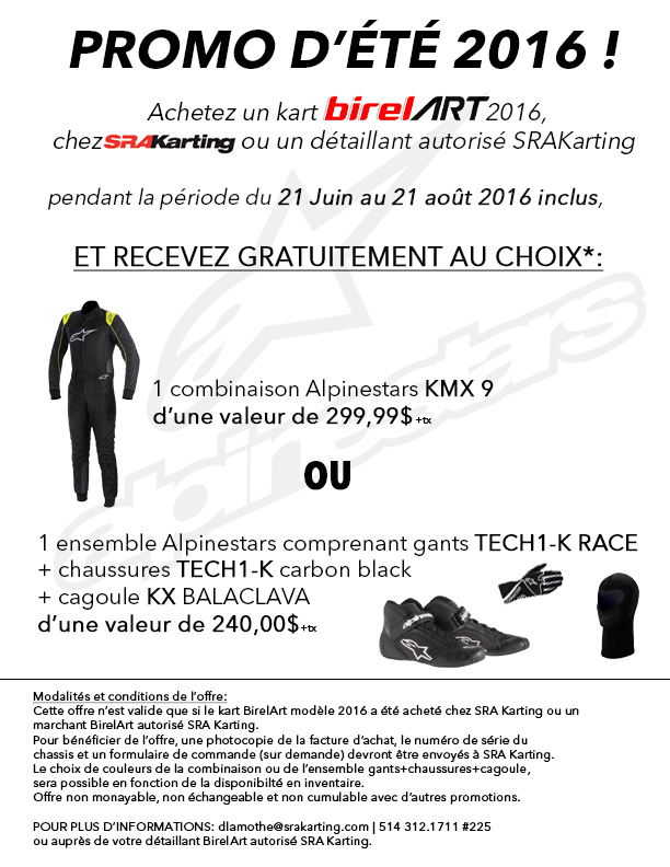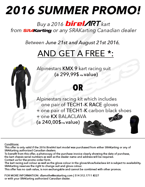 SRA Karting is offering a free Alpinestars KMX 9 kart racing suit OR Alplinestars racing kit (see details below) to those who purchase a new 2016 BirelART chassis from SRA Karting or any authorized SRA Karting dealer in Canada.