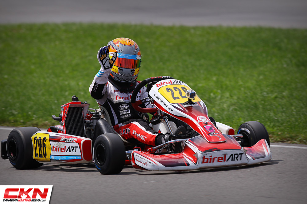 In Rotax Junior, Mackenzie Clark may have had a little extra help on Saturday en route to his big victory. Clark was racing with a heavy heart after the passing of his grandfather earlier in the week. Racing in his honour, Clark led every lap of the Junior Rotax Final to finally take home a Rotax Junior race victory. Zachary Vanier and Dale Curran completed the podium.