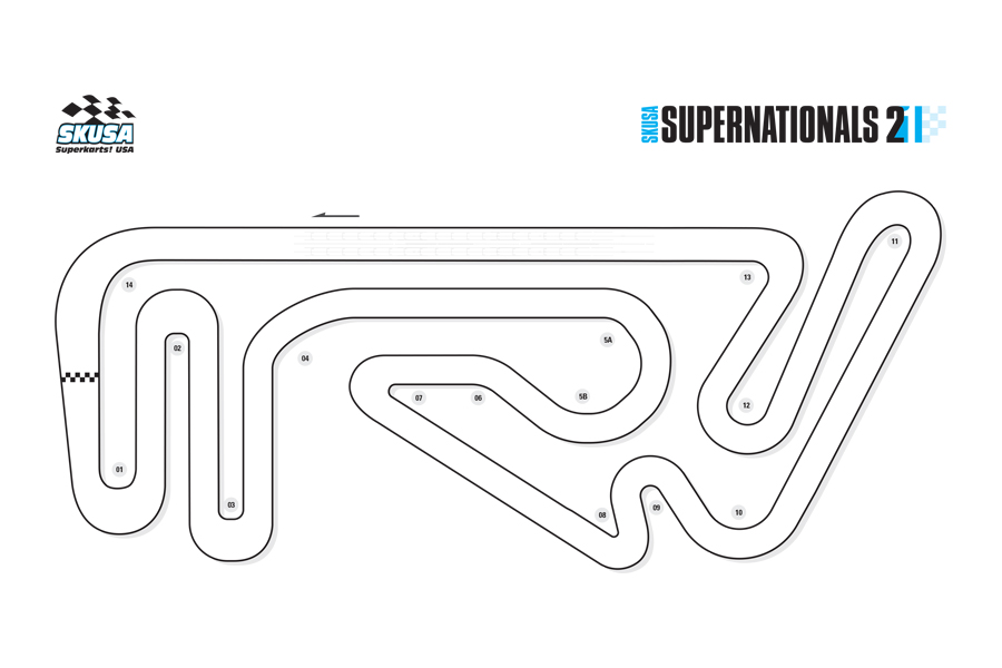 The circuit for the Superkarts! USA SuperNationals 21 measures out to roughly 8/10 of a mile in length with 14 turns. The only similar portion to last year’s track is the long front straight that leads into the fast, sweeping opening corner, followed by two 180-degree turns. The rest is all new, with a few sweeping corners, more hairpins, and a number of tight turns to challenge all the categories set to compete at SuperNationals 21.