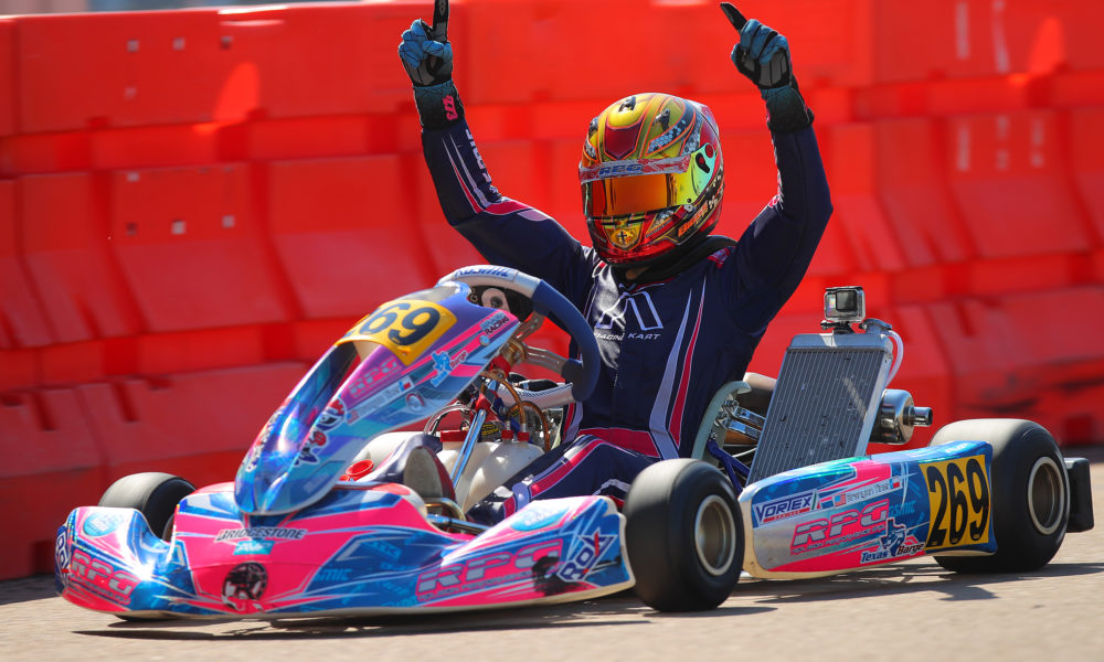 Finally, Liam Flanagan (Praga) completed his dominating weekend in Mini ROK, driving home a 4.2-second victory over Sebastian Wheldon (Kosmic) and his brother Oliver Wheldon (Kosmic). Gage Korn (Praga) finished fourth with all four drivers winning tickets to compete in Las Vegas.