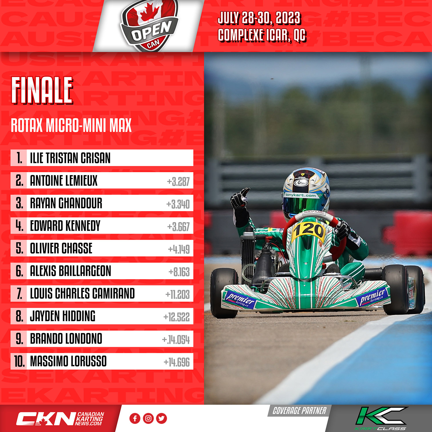 Making the most of his trip back home this summer, Ilie Tristan Crisan put forth a fantastic drive in the Rotax Mini Max Final at the Canadian Open to secure the title and earn his first invitation to compete on Team Canada at the Rotax Max Challenge Grand Finals.