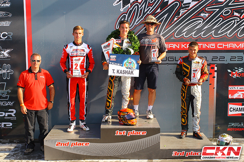 Rotax DD2 Podium from Left to Right: Patrick Moreau of Rotax Max Canada, Jeff Kingsley (2nd), Tyler and Paul Kashak (1st) and Austin Riley (3rd) – Photo by: Cody Schindel/CKN
