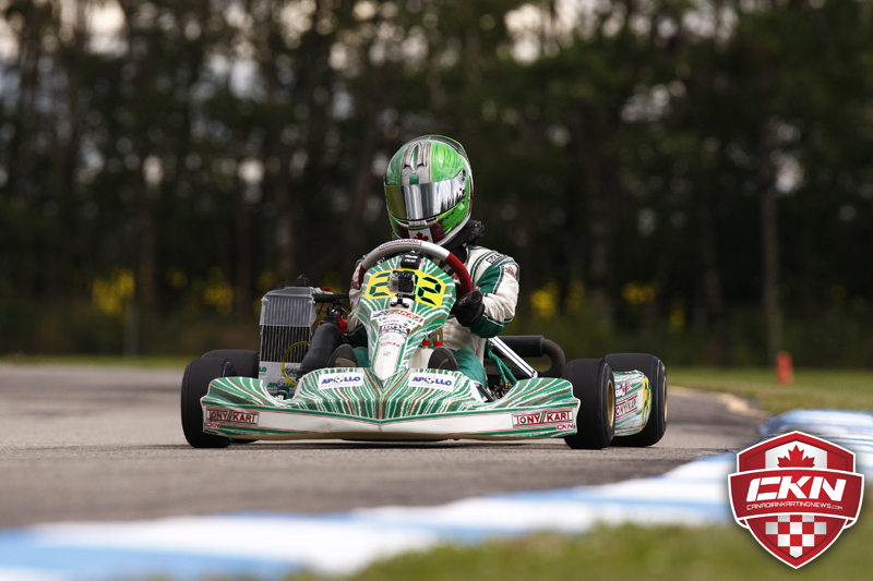This weekend, Jeffrey Kingsley (TonyKart) has been the class of the field in the dry conditions. The Ontario driver topped every dry session, while finishing third in the lone wet heat race on Saturday. On Sunday, the prefinal was much of the same, with Kingsley cruising to the finish to earn the pole-position for the Final. Keeping in touch with Kingsley was Coltin McCaughan (Apollo/TonyKart) as he managed his distance to the leader while staying away from the rest of the competition in the prefinal.