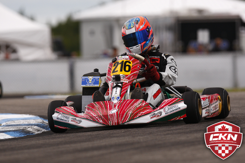 After qualifying, Ontario driver Jeffrey Kingsley (TonyKart) led the way in the first and second heat races, but after the rain fell in heat three Kingsley struggled to hang on to the top-five, eventually finishing third. Taking advantage in heat three was Coltin McCaughan (Apollo Motorsports/TonyKart), who easily cruised to the heat win after finishing second to Kingsley in the first two heats.