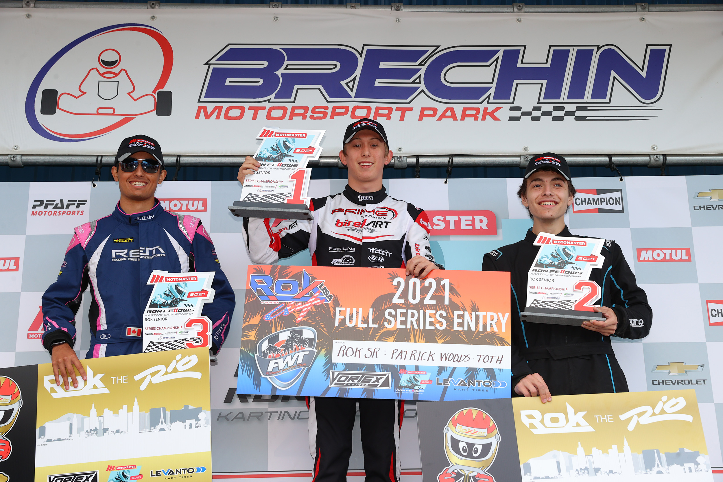 For the third straight Motomaster Ron Fellows Karting Championship season, Patrick Woods-Toth and Prime Powerteam are the Rok Senior Champions as the Quebec-based driver celebrated his fifth and sixth race wins of the season at Brechin Motorsport Park over the weekend to seal the deal.